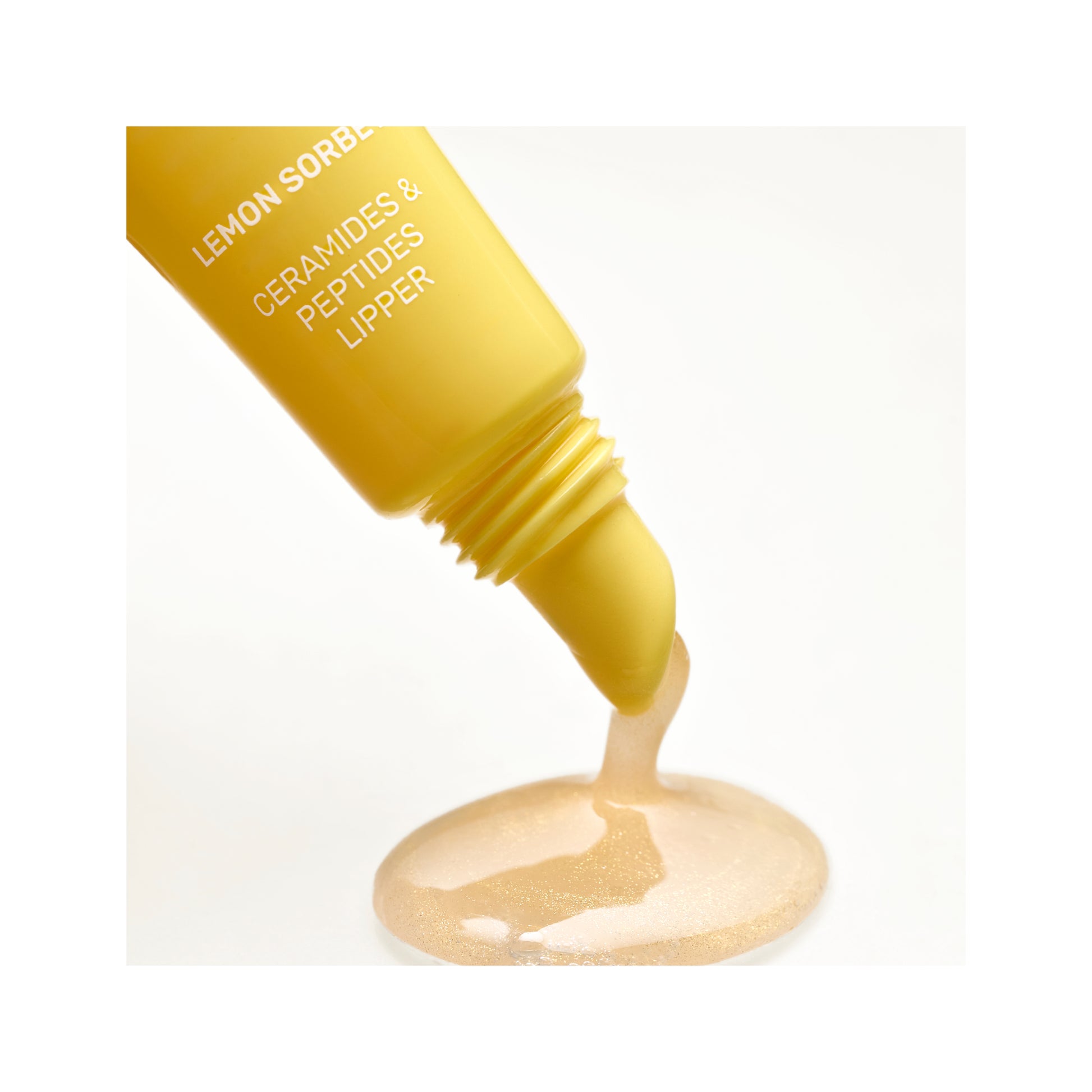 Прозорий блиск із золотими частинками та ароматом лимонного сорбету: миттєвий глянець, комфорт без липкості й поступове підсилення об’єму завдяки пептидам та рослинним екстрактам.
